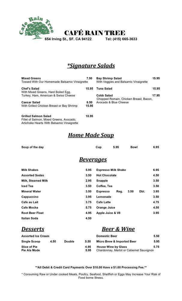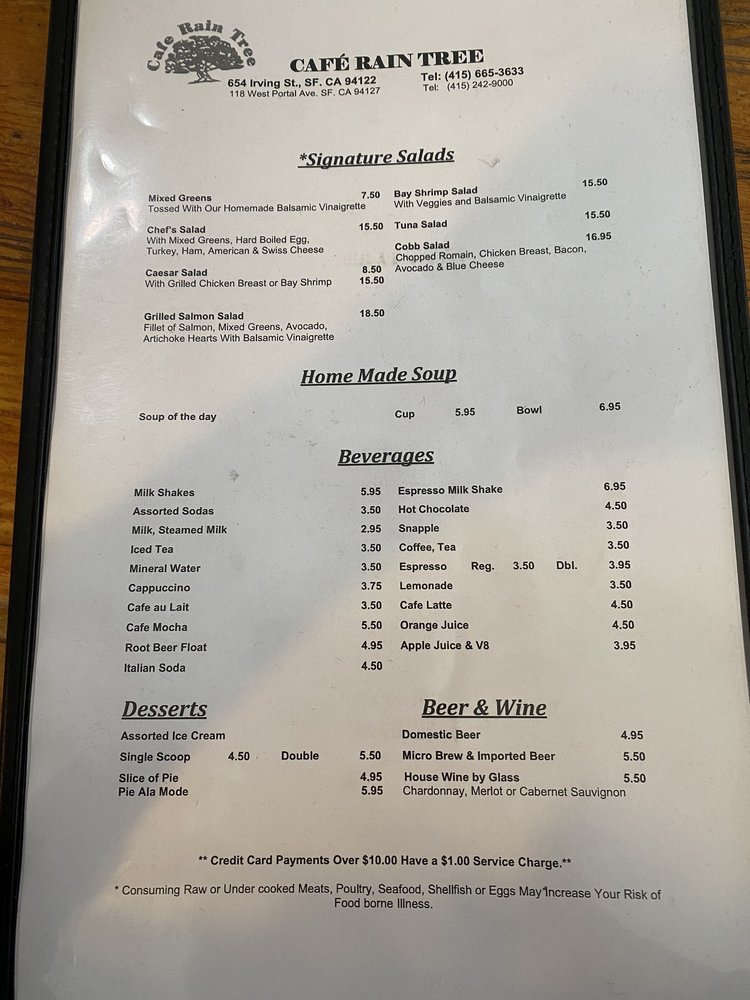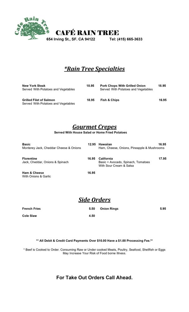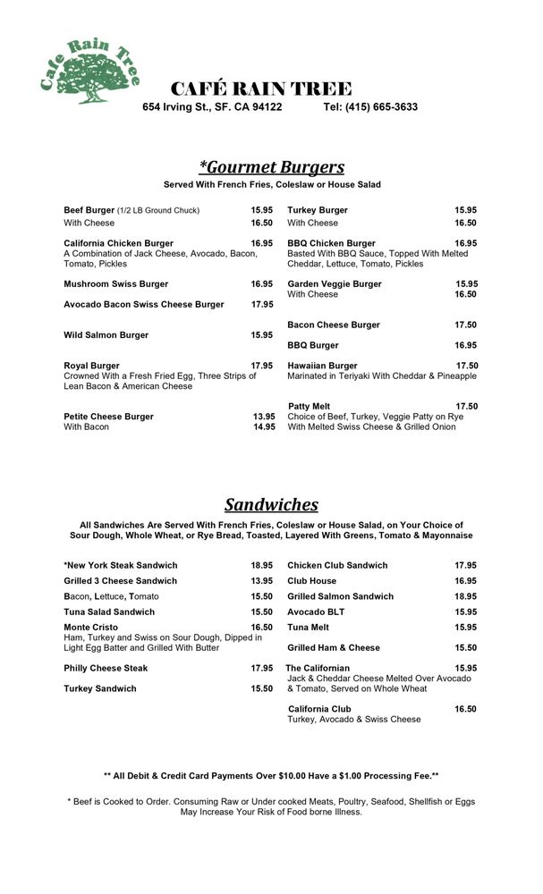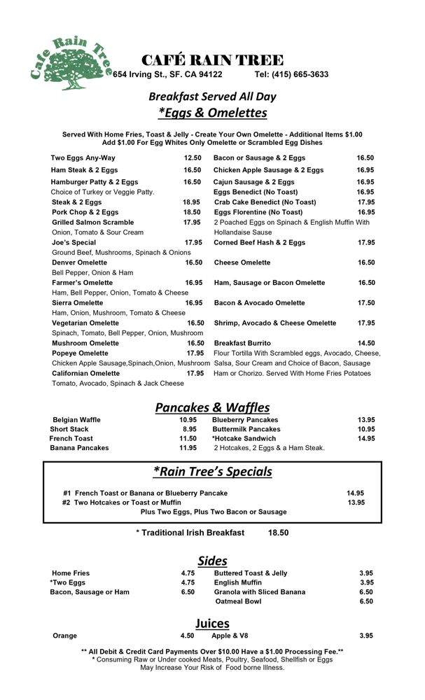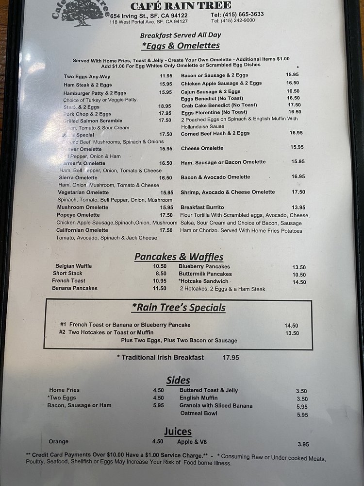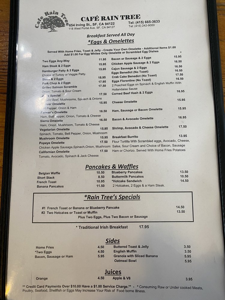 Located in the heart of San Francisco, Cafe Rain Tree is a charming diner that specializes in American breakfast and brunch. Their menu features a variety of delicious options, including hearty burgers, satisfying sandwiches, and nostalgic favorites like corned beef hash. The atmosphere is casual and cozy, making it an ideal spot for families and casual diners alike.